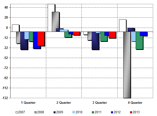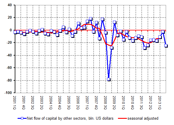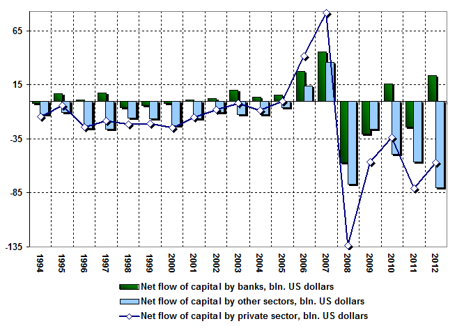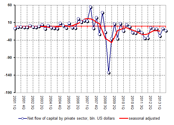 Outflow The first estimate of Balance of Payments by Bank of Russia shows 12.9 billions of US dollars of net capital outflow by private sector during the 3-rd Quarter of 2013. During the 3-rd Quarter of 2012 net capital outflow was equal 7.9 billions of US dollars.
