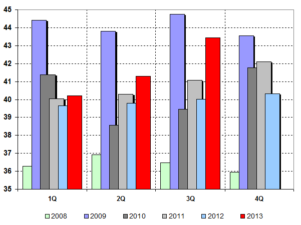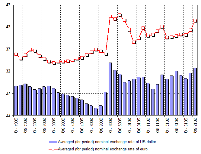 Averaged (for period) nominal exchange rate of euro is 43.43 ruble for 1 unit of currency for the 3-rd Quarter of 2013 (40.01 ruble for 1 unit of currency for the corresponding period of 2012).