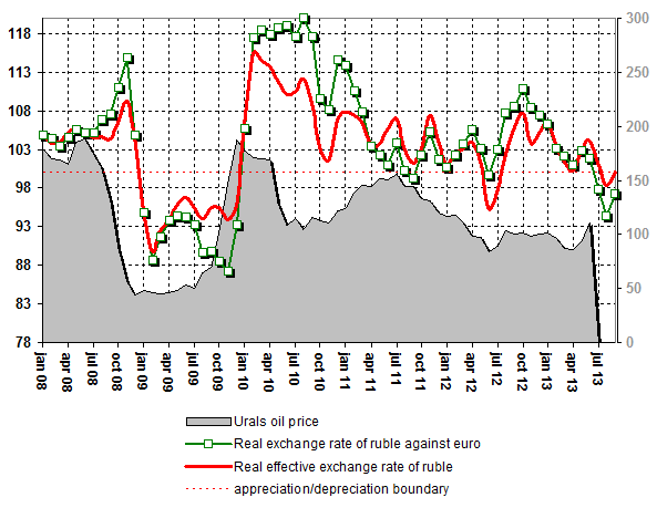 Historical dynamics of real exchange rate of ruble (foreign currency per 1 ruble, all indicators - % of corresponding period of previous year)