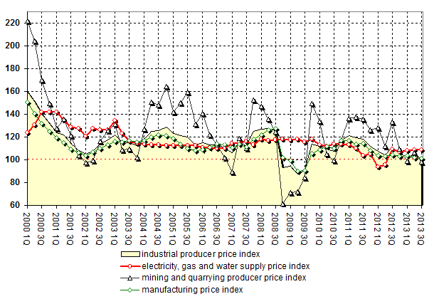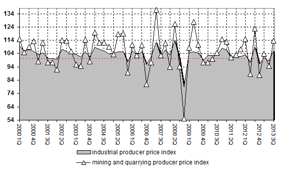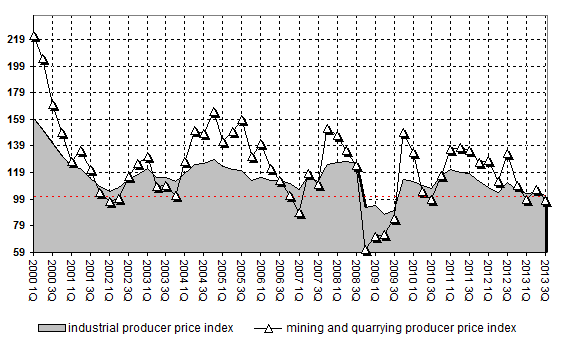 Mining and quarrying producer price index is 113.8% of previous period or 98.3% of corresponding period of previous year for 3-rd Quarter of 2013. Historically, indices are 122.7% and 133.4% for 3-rd Quarter of 2012 correspondingly.