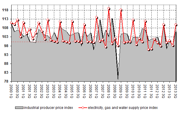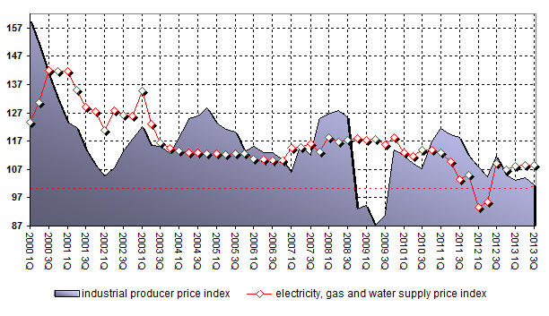 Electricity, gas and water supply producer price index is 109.8% of previous period and 108.6% of corresponding period of previous year for 3-rd Quarter of 2013. 109.8% and 109.1% for 3-rd Quarter of 2012 correspondingly.
