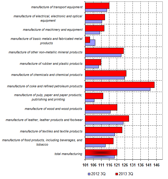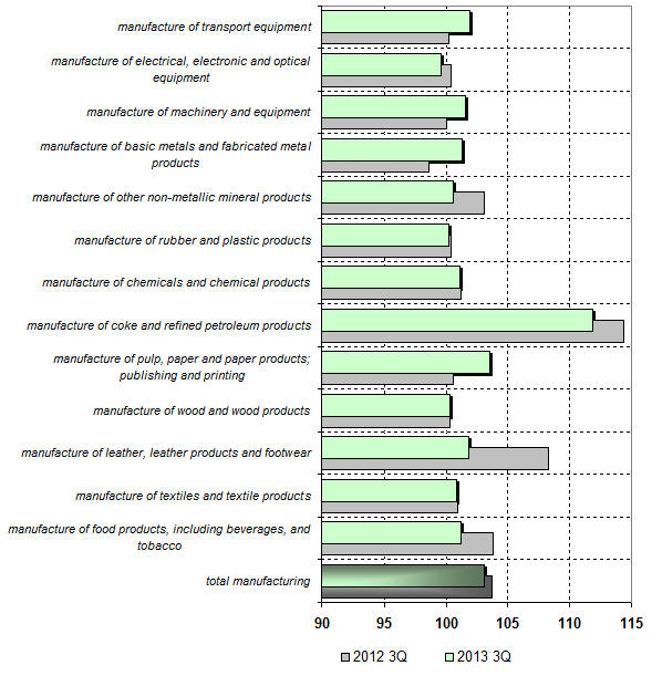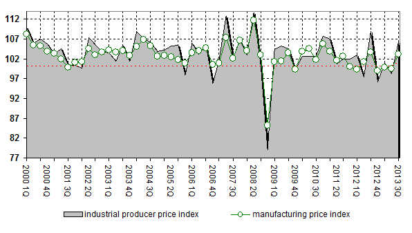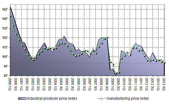 Manufacturing industry producer price index is 103.1% of previous period and 101.5% of corresponding period of previous year for 3-rd Quarter of 2013. Numbers are 103.7% and 104.3% for 3-rd Quarter of 2012 correspondingly.