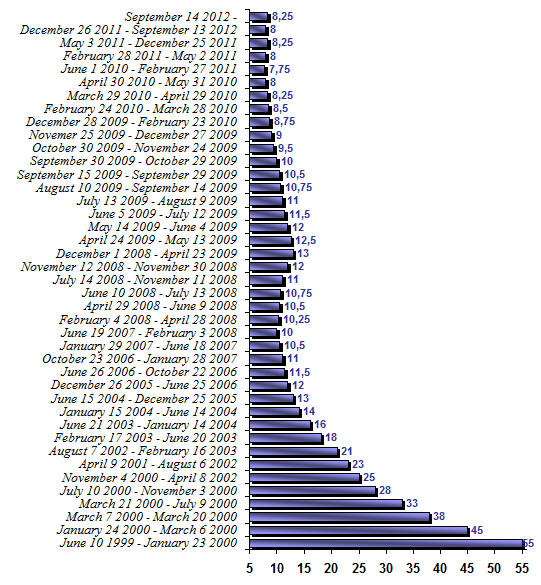 Dynamics of Refinancing Rate of Bank of Russia (%)