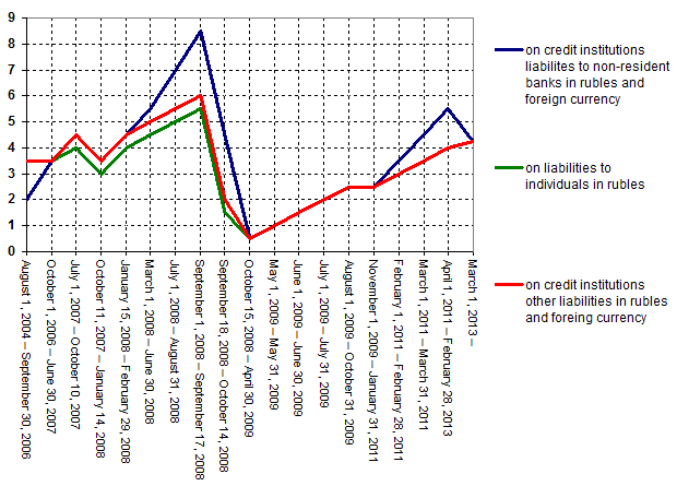 Required Reserve Ratio on credit institutions liabilities to non-resident corporate entities, to the private individuals and other liabilities is 4.25% (valid from March 1, 2013).