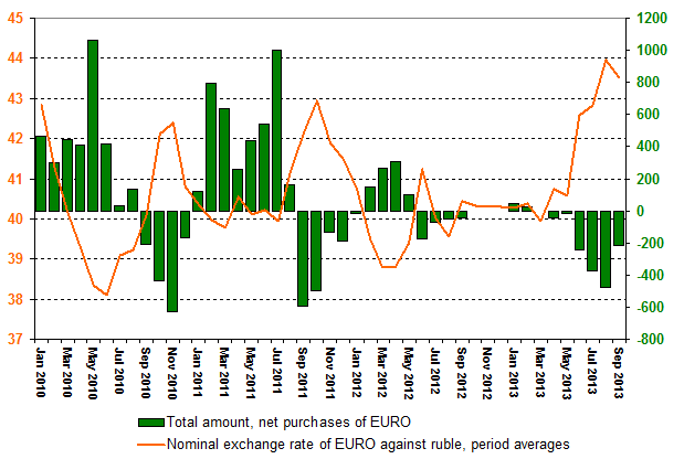 Volume of foreign exchange market interventions of Bank of Russia (mln. USD mln. EURO)