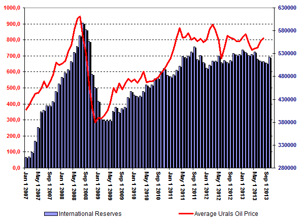 International Reserves of the Russian Federation in comparison with Crude Oil Prices (Reserves - mln. USD, Oil Price - USD per 1 metric ton)