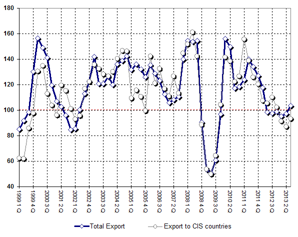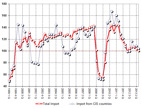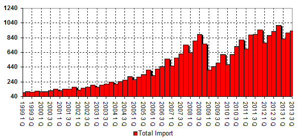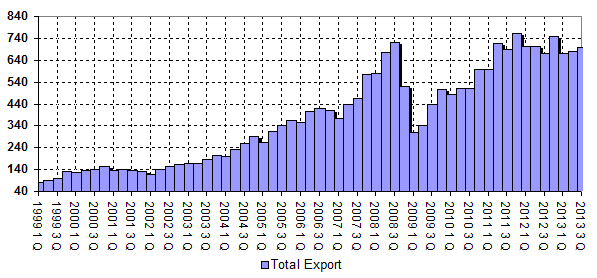 Trade Russia's Total Export equals 130.149 bln. US dollars for 3-rd Quarter of 2013 - 3.7% of increase compared with 3-rd Quarter of 2012. Total Import is 87.333 bln. US dollars - 0.4% of increase compared with 3-rd Quarter of 2012. Historically, indices are 2.2 of decrease (Export) and 4.7 of increase (Import) correspondingly.