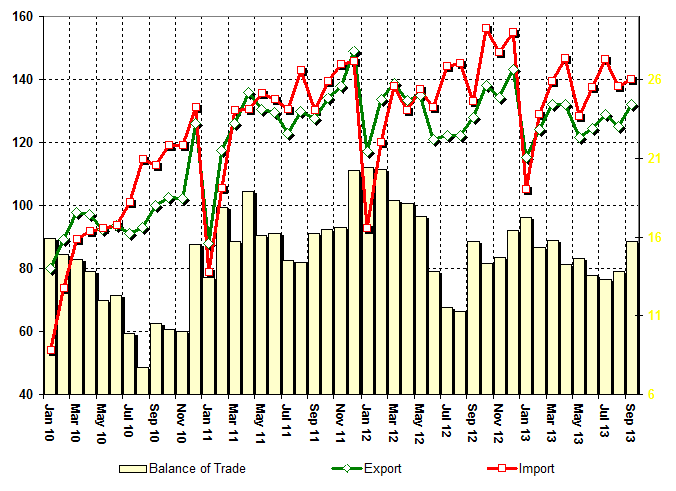 Balance of Trade is 42.816 bln. US dollars for 3-rd Quarter for 2013. 38.490 bln. US dollars for corresponding period of 2012.
