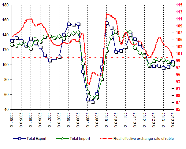 Russia's Export, Import in comparison with Real Effective Exchange Rate of Ruble (% of corresponding period of previous year )
