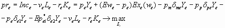 где Особенностью модели является описание особенностей экономического поведения предприятий в секторах ЭОС, ВОС и ЕМ. Мотив извлечения максимальной прибыли от производства характерен для современных российских экономических реалий. В частности, для предприятий сектора ЭОС характерен выбор численности занятых исходя из критерия максимизации прибыли производства: